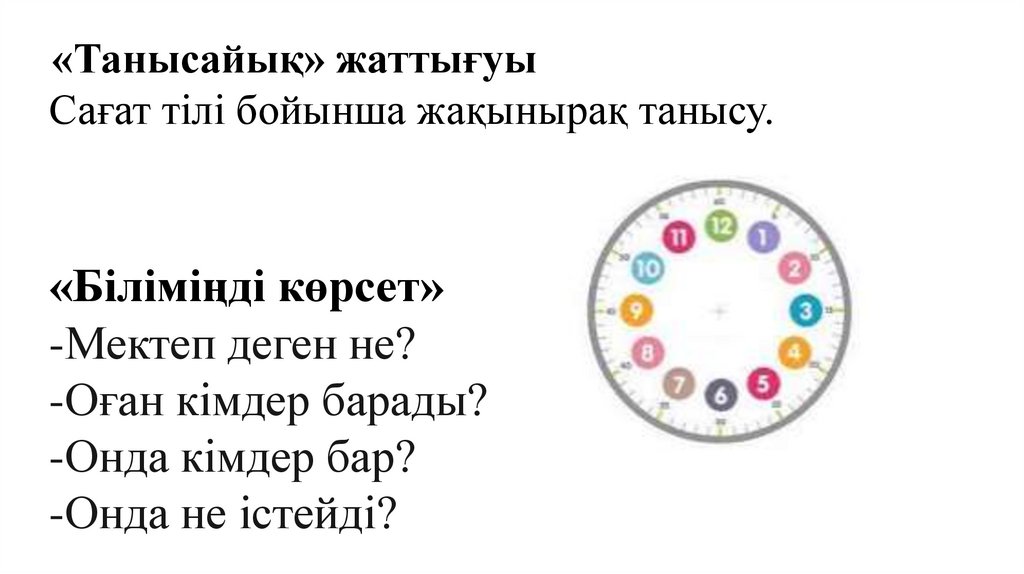 «Танысайық» жаттығуыСағат тілі бойынша жақынырақ танысу.