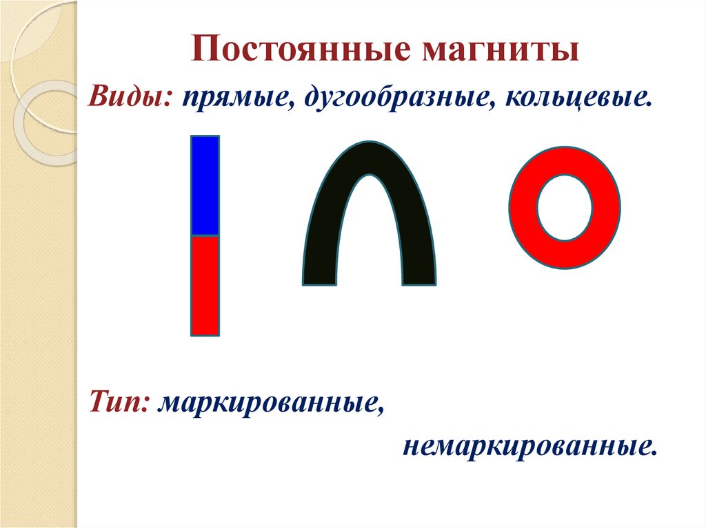 Постоянные магнитыВиды: прямые, дугообразные, кольцевые.