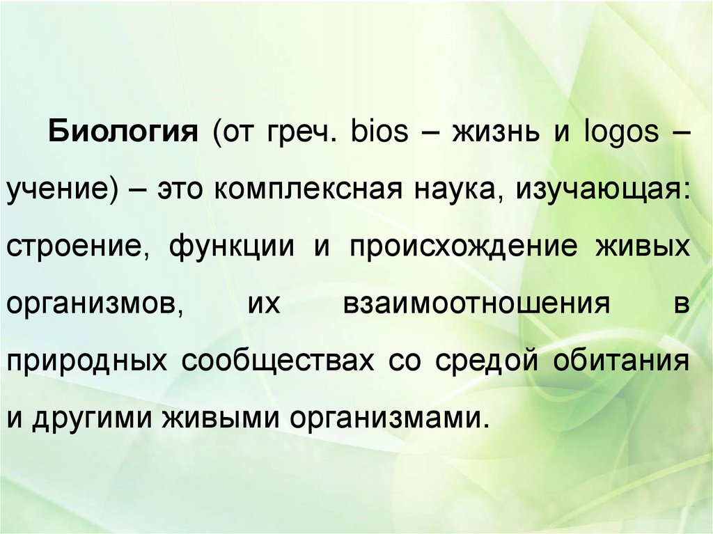 Биология (от греч. bios – жизнь и logos –учение) – это комплексная наука, изучающая: