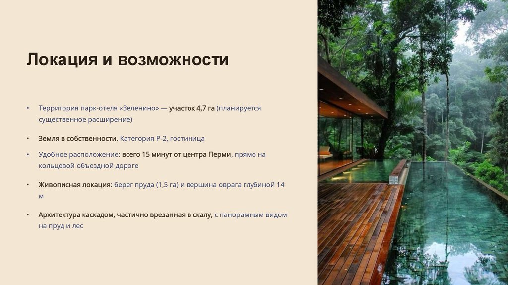 Локация и возможностиТерритория парк-отеля «Зеленино» — участок 4,7 га (планируется