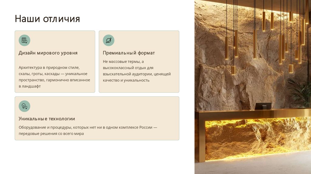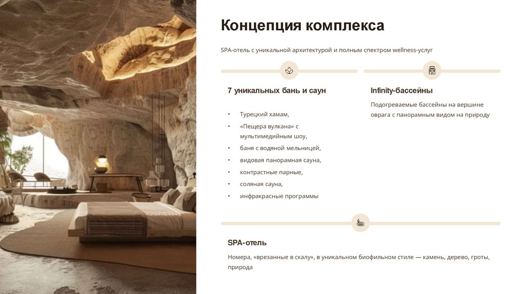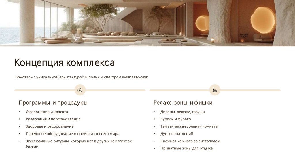 Концепция комплексаSPA-отель с уникальной архитектурой и полным спектром wellness-услуг