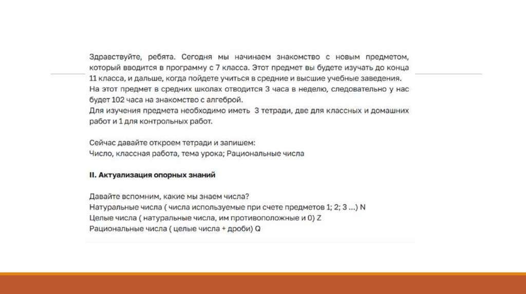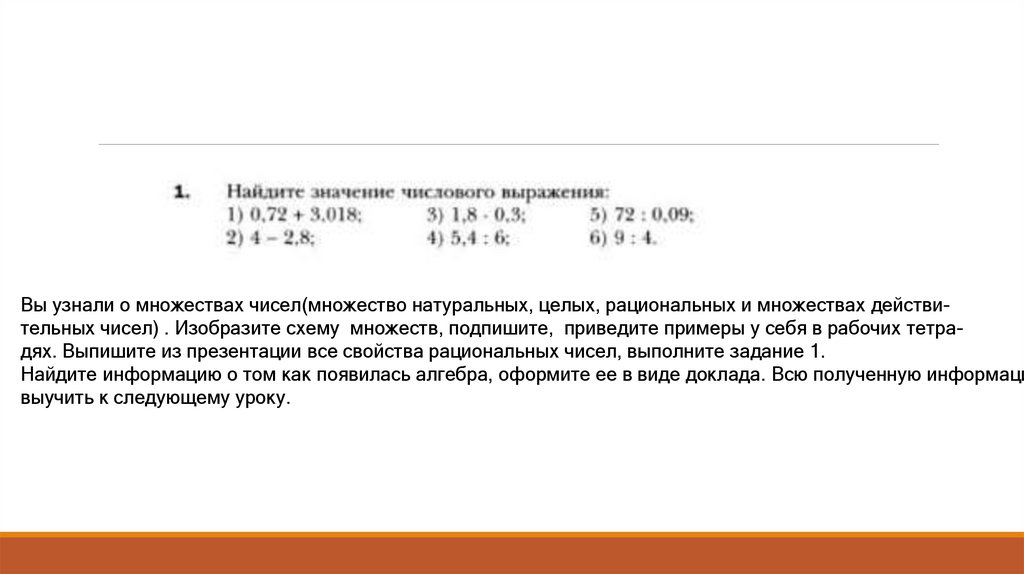 Вы узнали о множествах чисел(множество натуральных, целых, рациональных и множествах действительных чисел) . Изобразите схему множеств, подпишите, приведите примеры у себя в рабочих тетрадях. Выпишите из презентации все свойства рациональных чисел, выполните задание 1.Найдите информацию о том как появилась алгебра, оформите ее в виде доклада. Всю полученную информаци