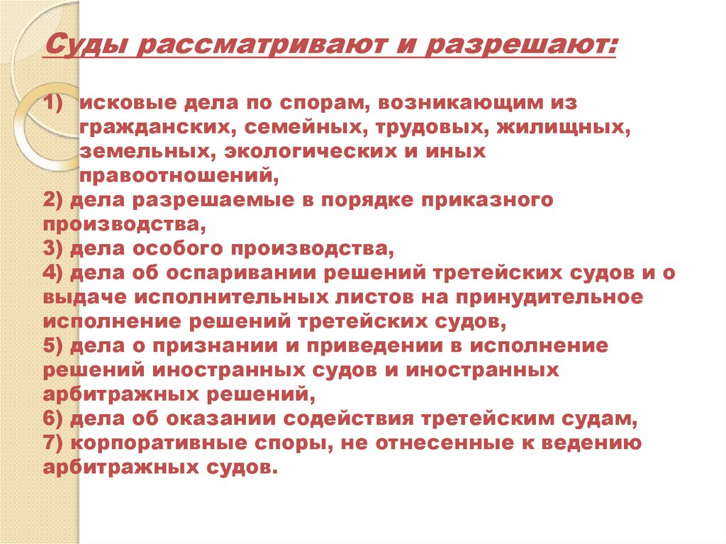 Суды рассматривают и разрешают:1) исковые дела по спорам, возникающим из