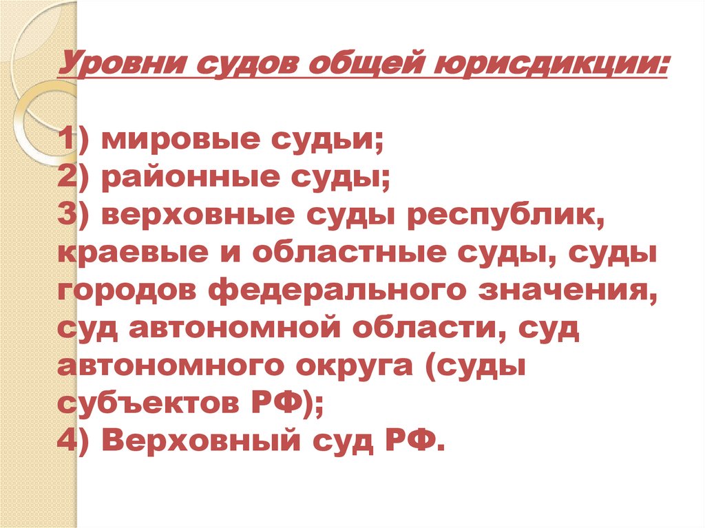 Уровни судов общей юрисдикции:1) мировые судьи;