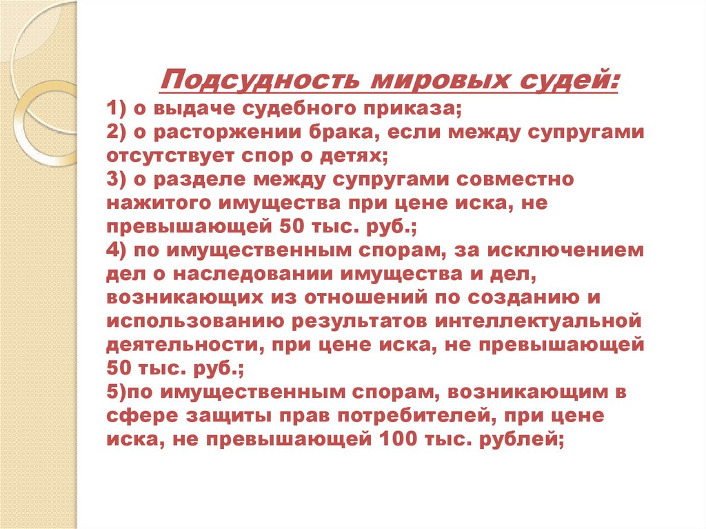 Подсудность мировых судей:1) о выдаче судебного приказа;