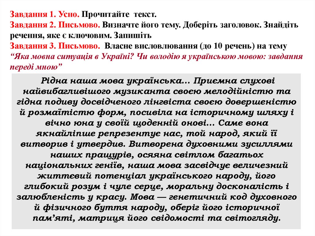 Завдання 1. Усно. Прочитайте текст.Завдання 2. Письмово. Визначте його тему. Доберіть заголовок. Знайдіть