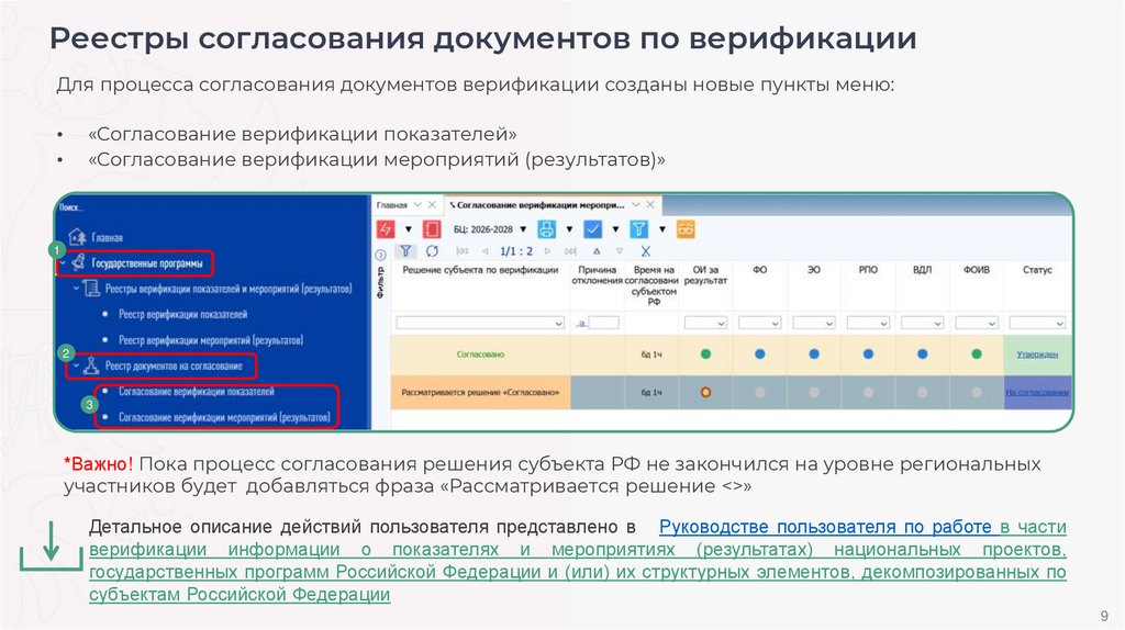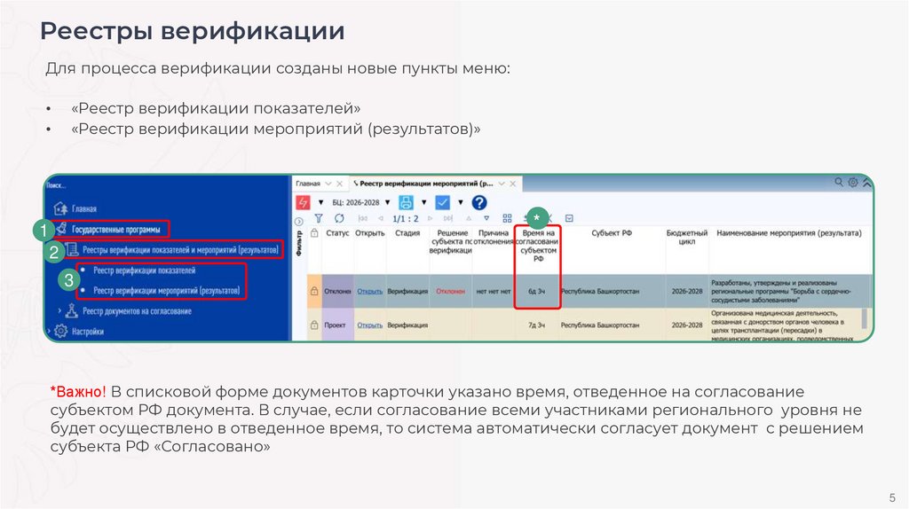 Реестры согласования документов по верификацииДля процесса согласования документов верификации созданы новые пункты меню: