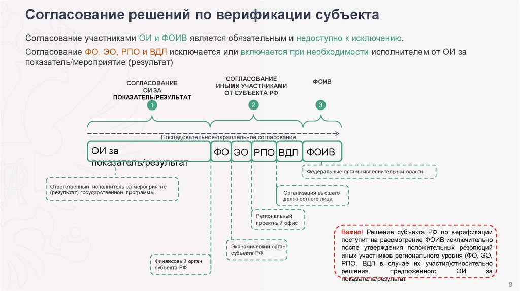 Согласование решений по верификации субъектаСогласование участниками ОИ и ФОИВ является обязательным и недоступно к исключению.