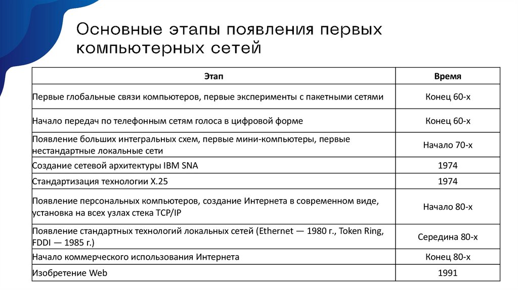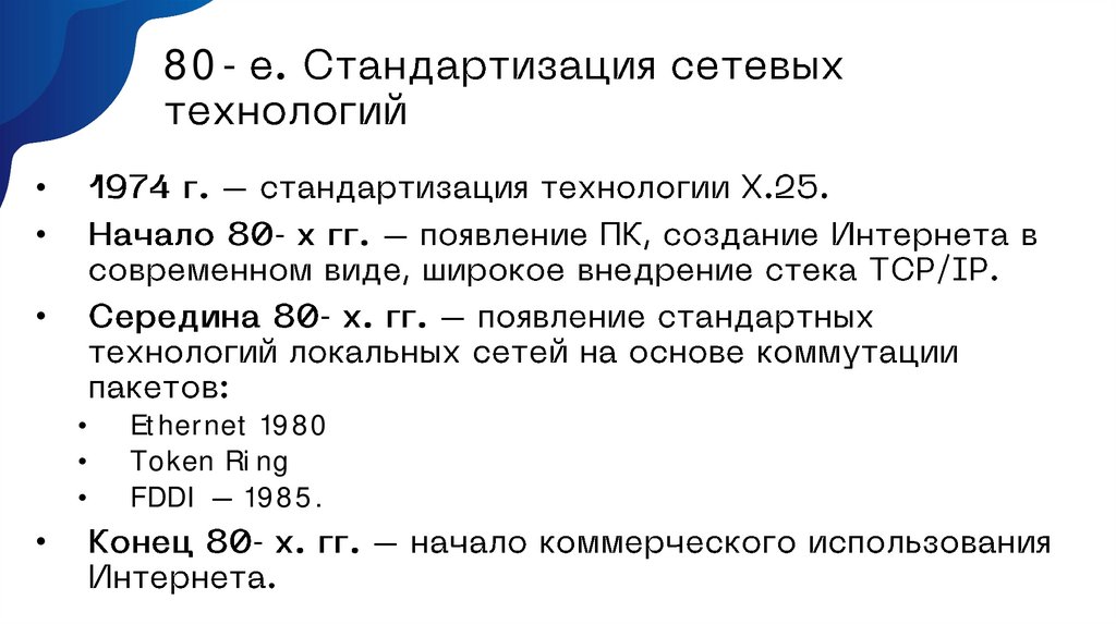 Появление стандартных технологий локальных сетей (Ethernet — 1980 г., Token Ring,