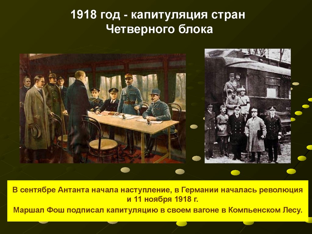 Маршал Фош подписал капитуляцию в своем вагоне в Компьенском Лесу.