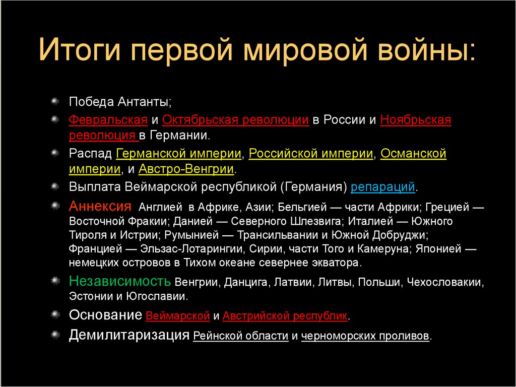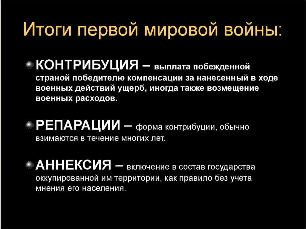 Итоги первой мировой войны:КОНТРИБУЦИЯ – выплата побежденной