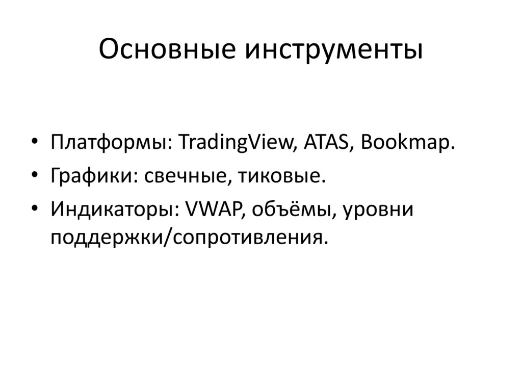 Основные инструменты• Платформы: TradingView, ATAS, Bookmap.
