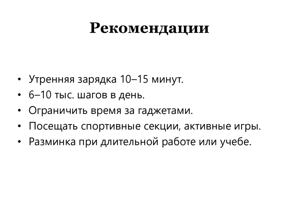 Рекомендации• Утренняя зарядка 10–15 минут.