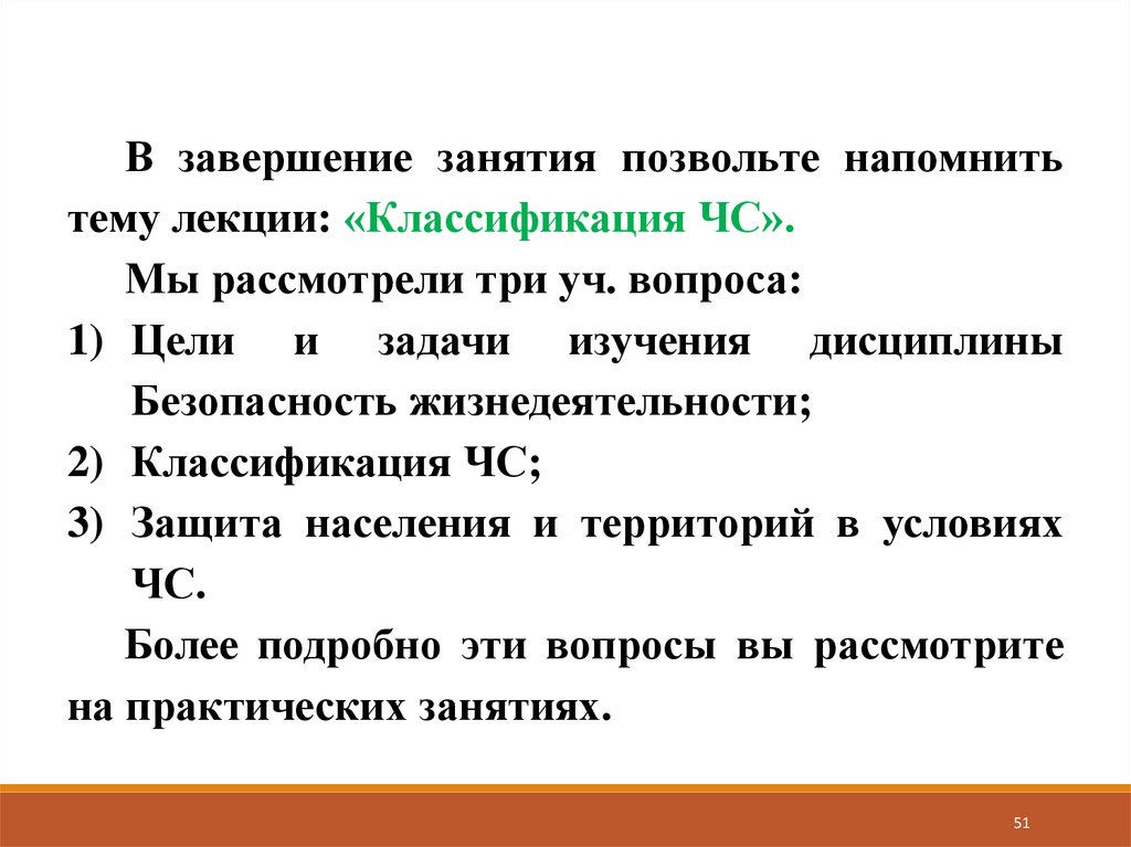 В завершение занятия позвольте напомнитьтему лекции: «Классификация ЧС».