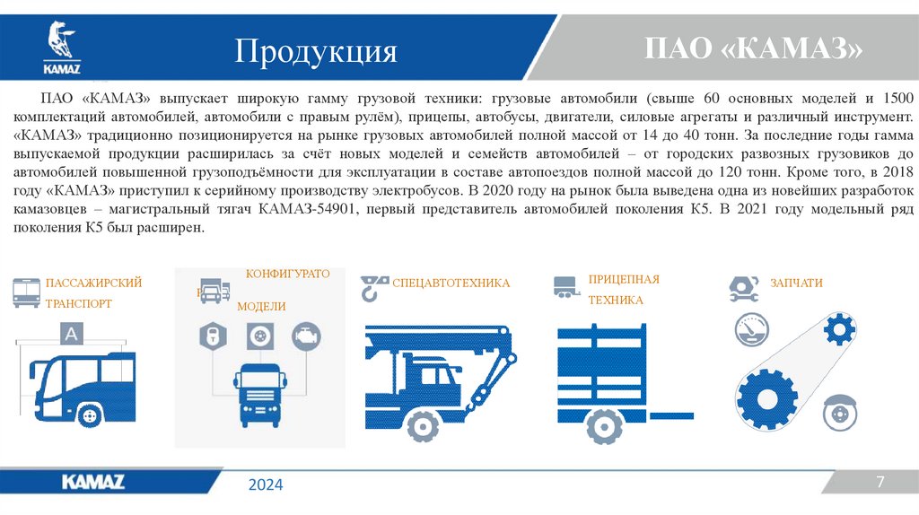 ПАО «КАМАЗ» выпускает широкую гамму грузовой техники: грузовые автомобили (свыше 60 основных моделей и 1500