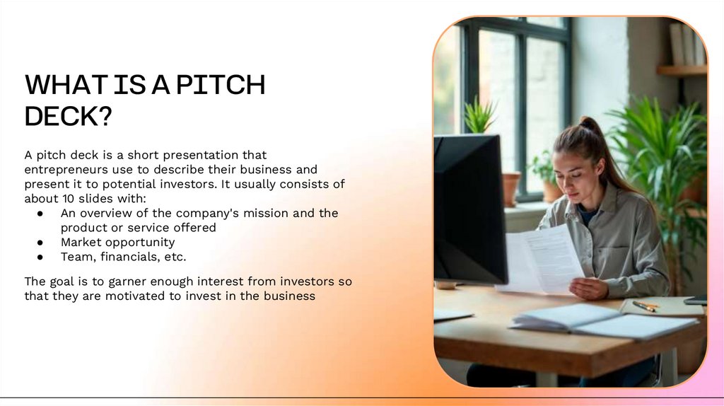 A pitch deck is a short presentation that
