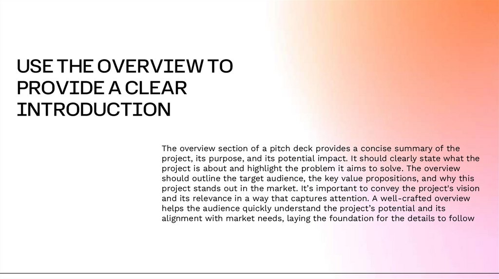 The overview section of a pitch deck provides a concise summary of the