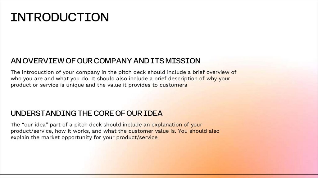 The introduction of your company in the pitch deck should include a brief overview of