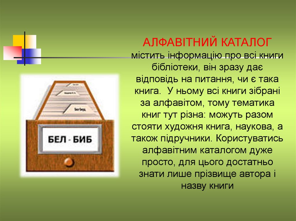 АЛФАВІТНИЙ КАТАЛОГмістить інформацію про всі книги