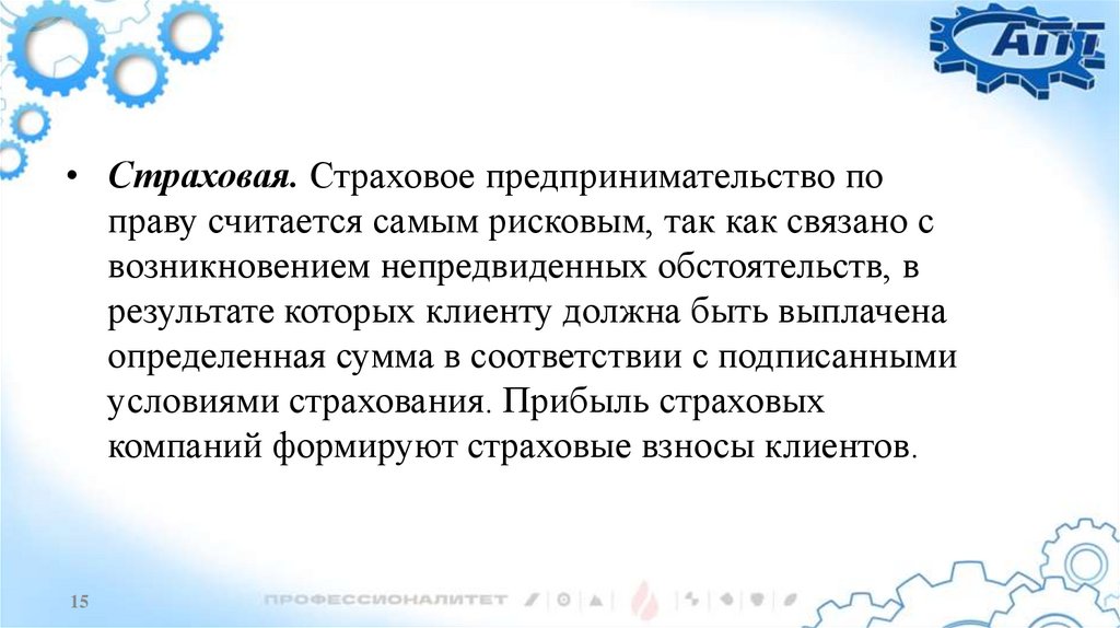 • Страховая. Страховое предпринимательство поправу считается самым рисковым, так как связано с