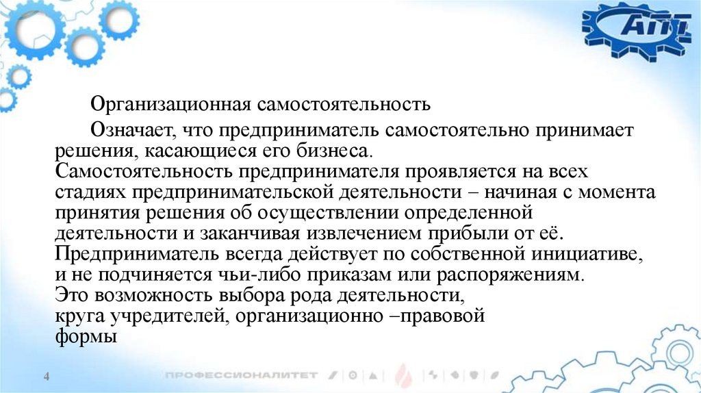 Организационная самостоятельностьОзначает, что предприниматель самостоятельно принимает