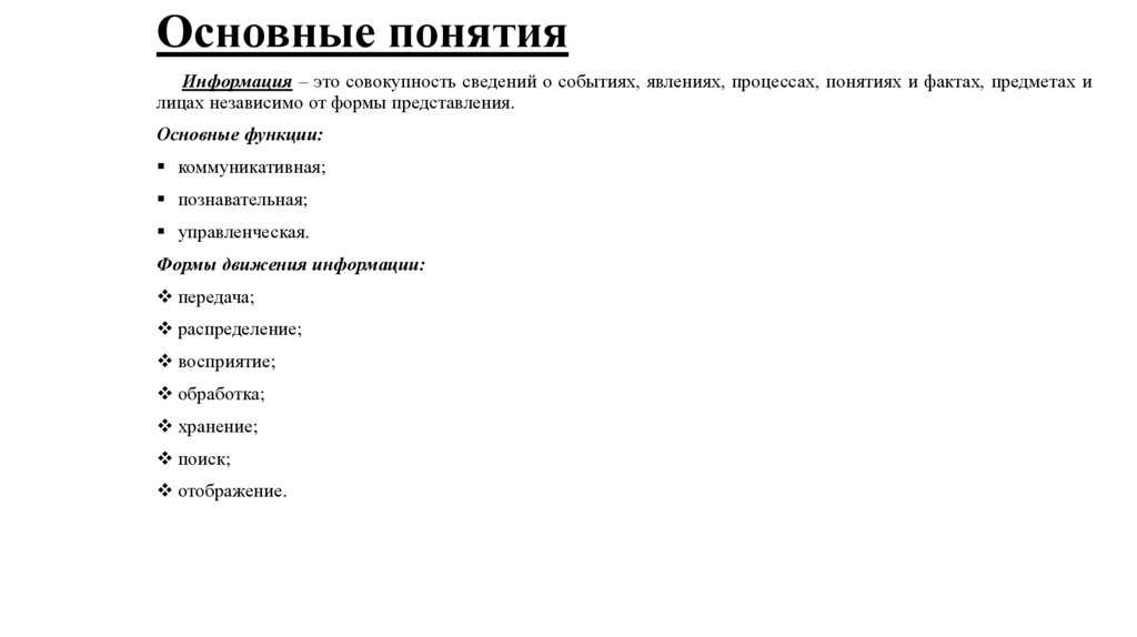 Основные понятияИнформация – это совокупность сведений о событиях, явлениях, процессах, понятиях и фактах, предметах и
