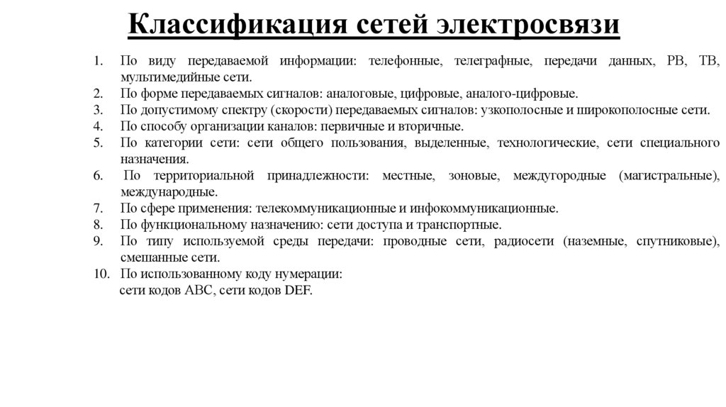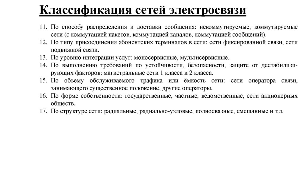 Классификация сетей электросвязиПо виду передаваемой информации: телефонные, телеграфные, передачи данных, РВ, ТВ,