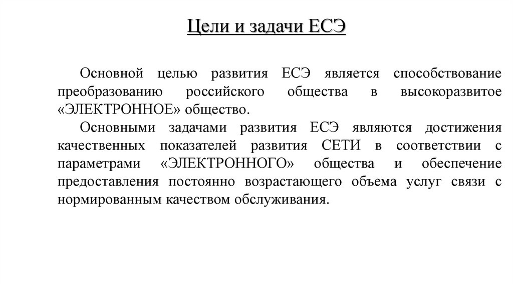Цели и задачи ЕСЭОсновной целью развития ЕСЭ является способствование