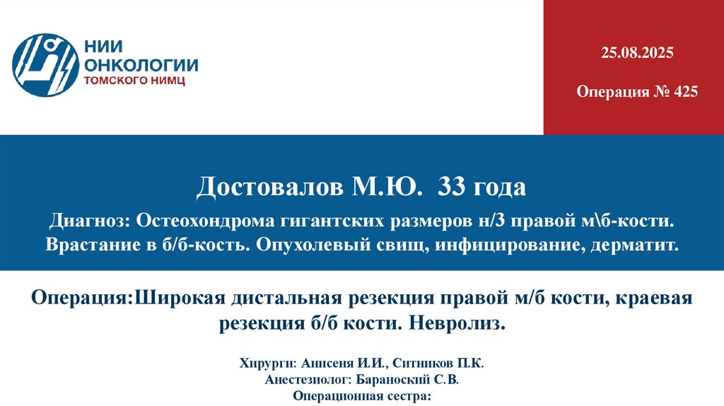 1. Операция:Широкая дистальная резекция правой м/б кости, краевая резекция б/б кости. Невролиз. Хирурги: Анисеня И.И., Ситников