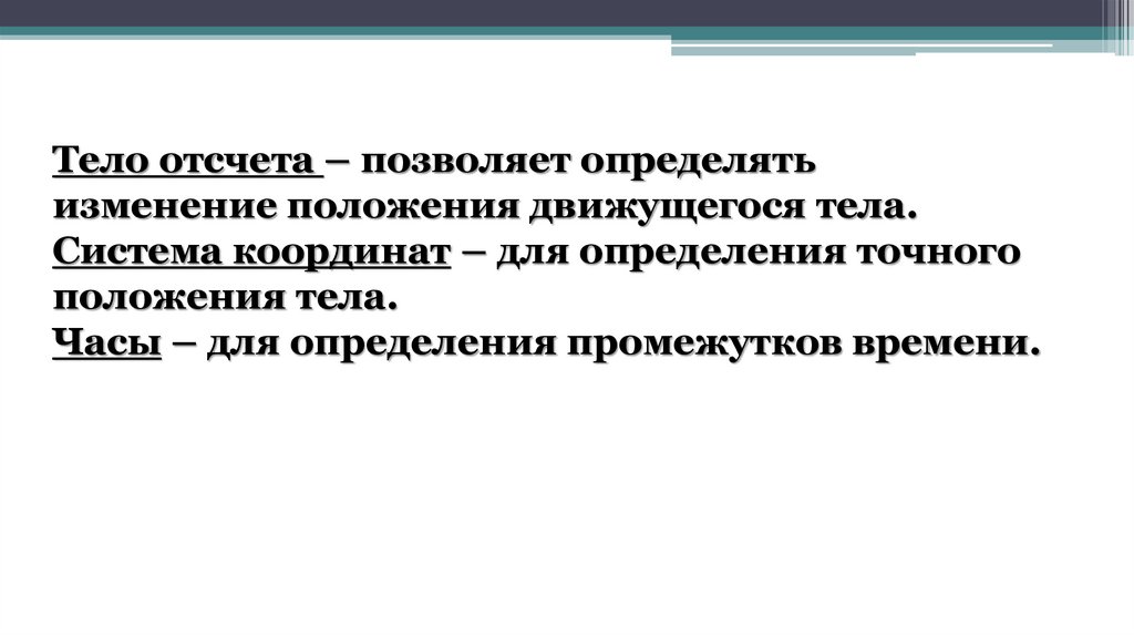Тело отсчета – позволяет определятьизменение положения движущегося тела.