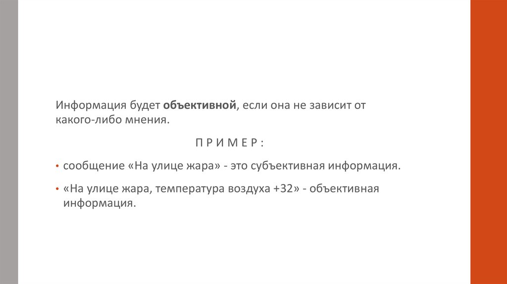 • сообщение «На улице жара» - это субъективная информация.