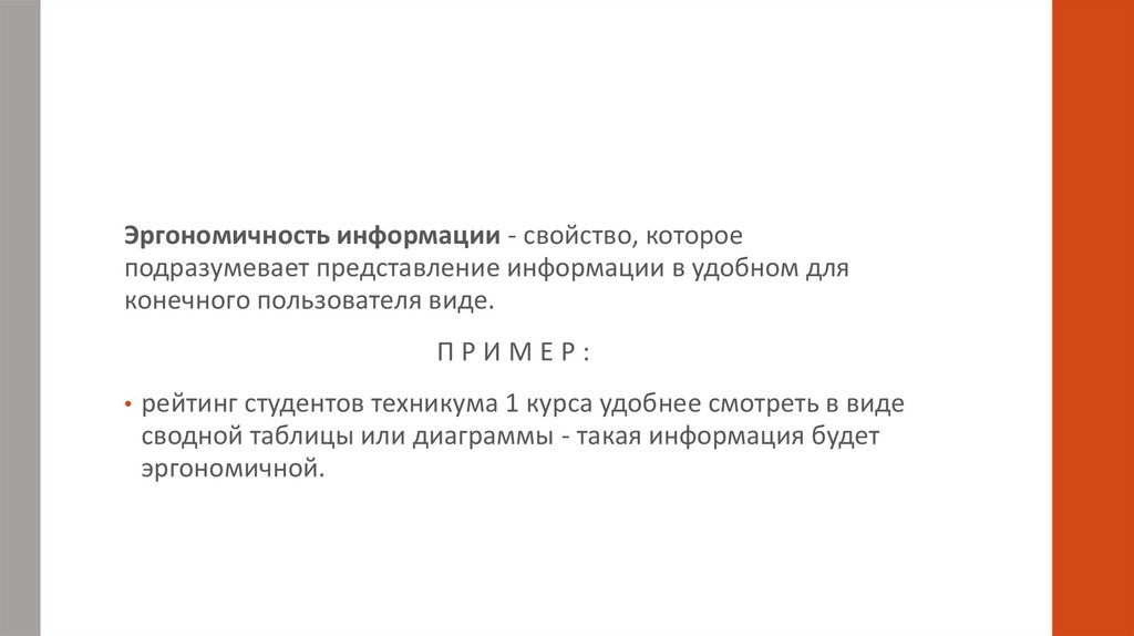 Эргономичность информации - свойство, котороеподразумевает представление информации в удобном для