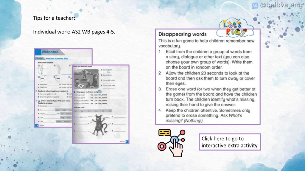 Tips for a teacher:Individual work: AS2 WB pages 4-5.