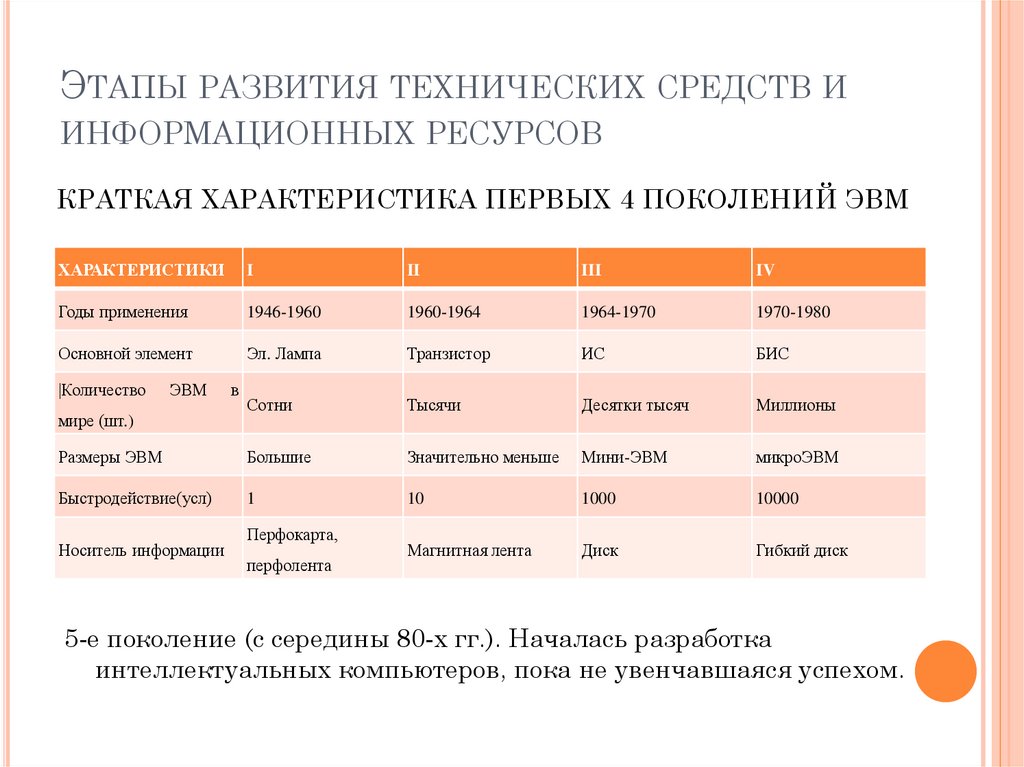 КРАТКАЯ ХАРАКТЕРИСТИКА ПЕРВЫХ 4 ПОКОЛЕНИЙ ЭВМ