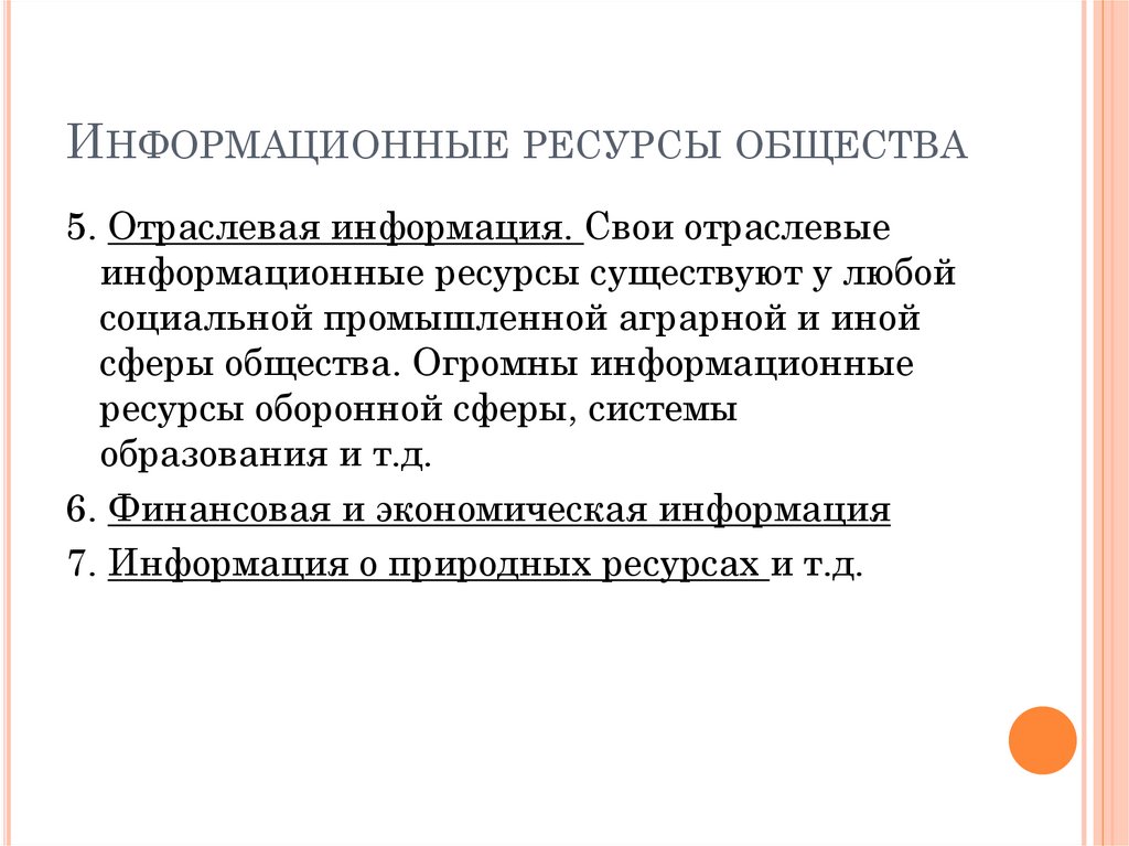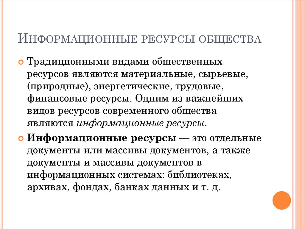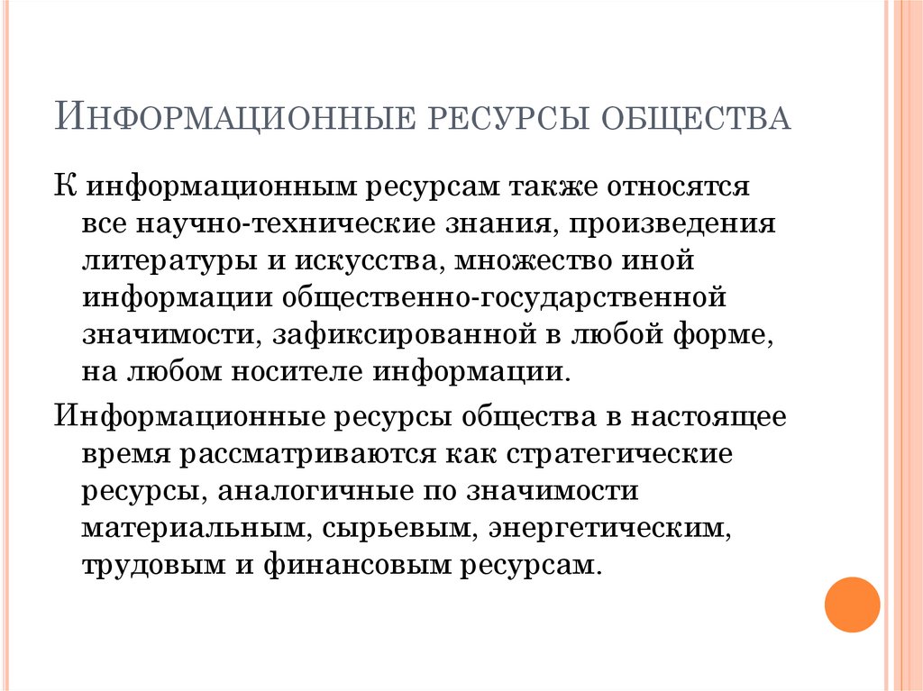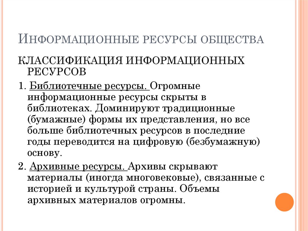 ИНФОРМАЦИОННЫЕ РЕСУРСЫ ОБЩЕСТВАК информационным ресурсам также относятся