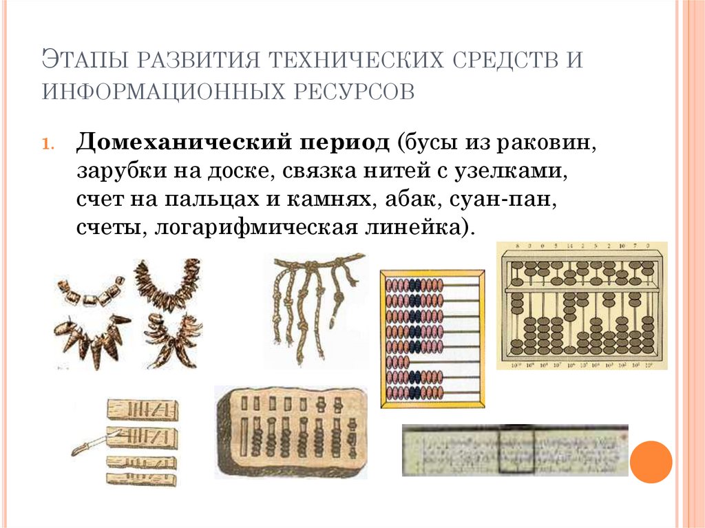 счеты, логарифмическая линейка).