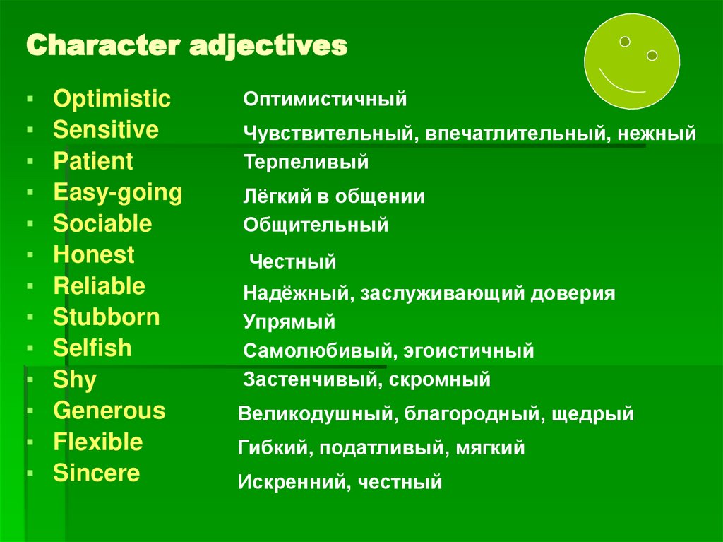Translate the words into English.Терпеливый, Застенчивый, Надёжный,