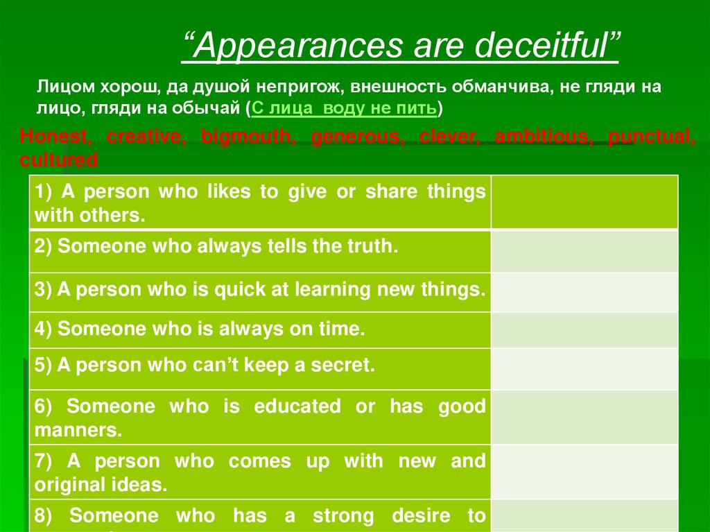 “Appearances are deceitful”Лицом хорош, да душой непригож, внешность обманчива, не гляди на