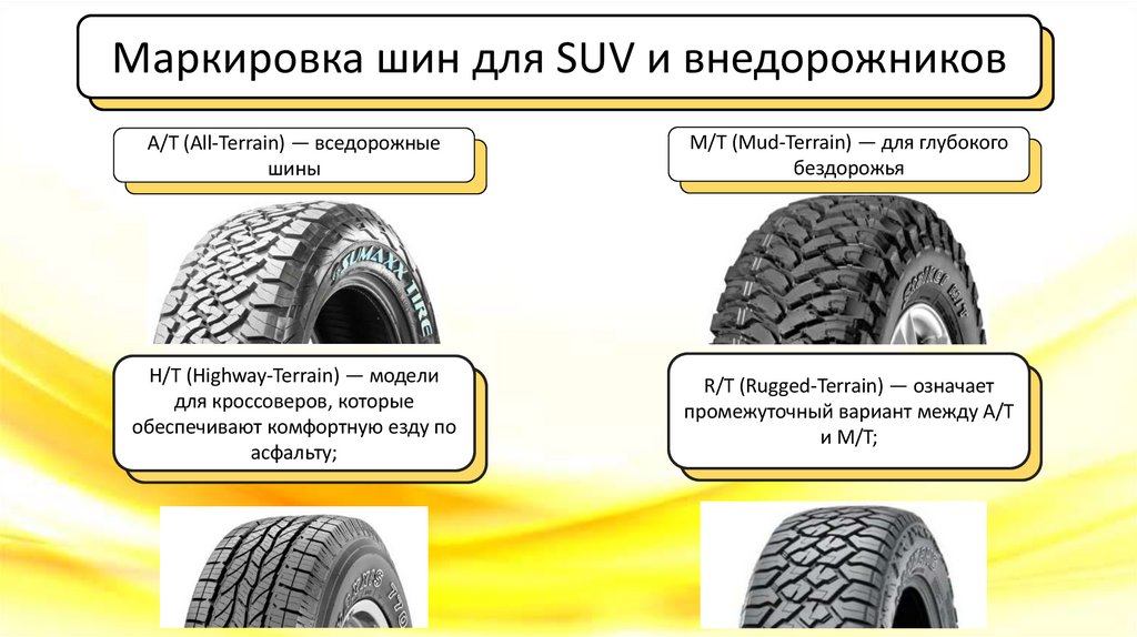 Маркировка шин для SUV и внедорожниковA/T (All-Terrain) — вседорожные