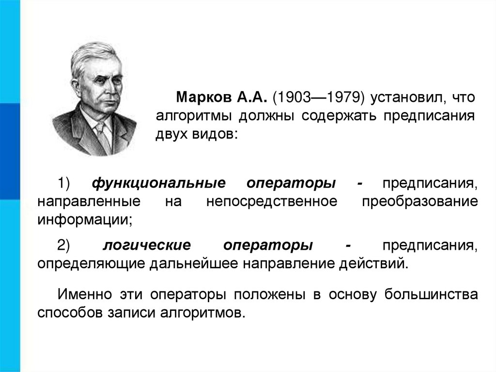 Марков А.А. (1903—1979) установил, чтоалгоритмы должны содержать предписания