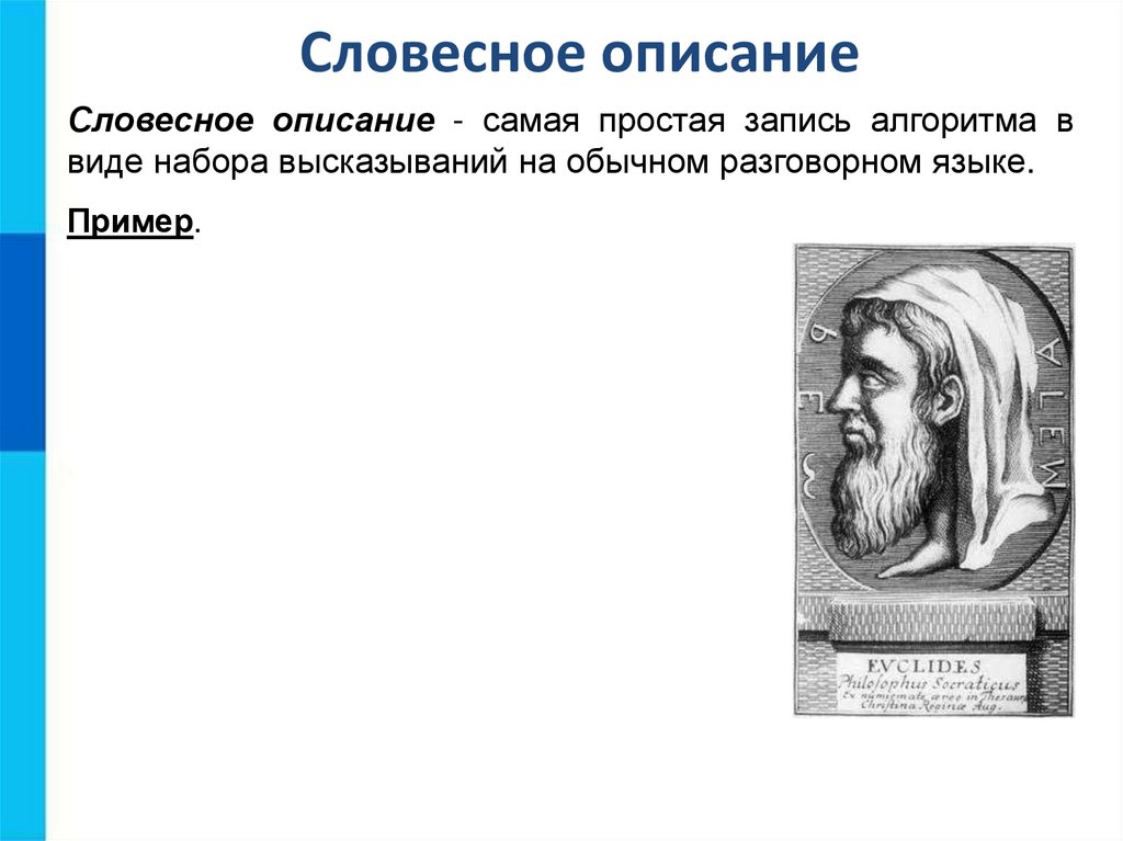 Словесное описаниеСловесное описание - самая простая запись алгоритма в