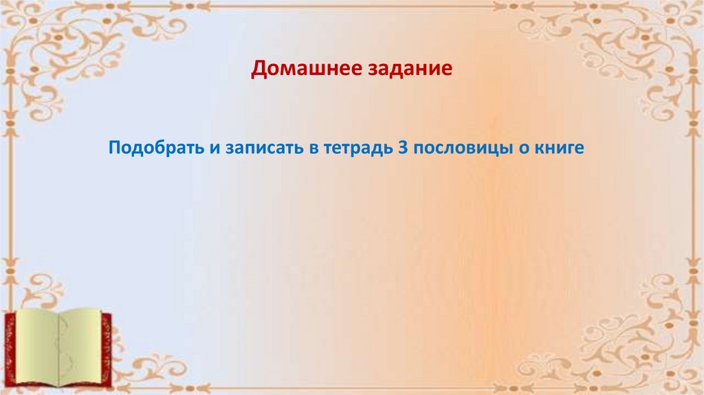Домашнее заданиеПодобрать и записать в тетрадь 3 пословицы о книге