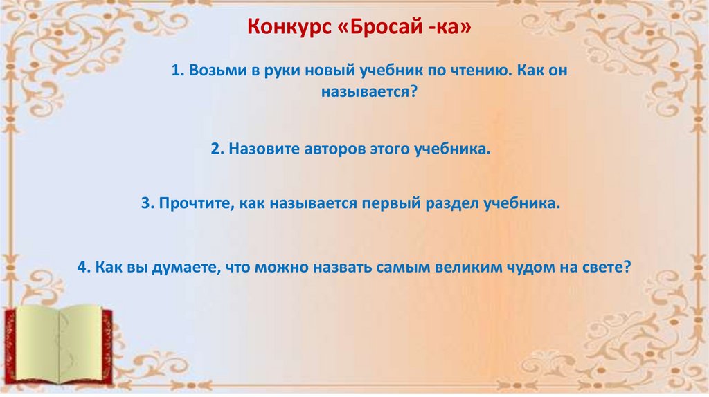 Конкурс «Бросай -ка»1. Возьми в руки новый учебник по чтению. Как он