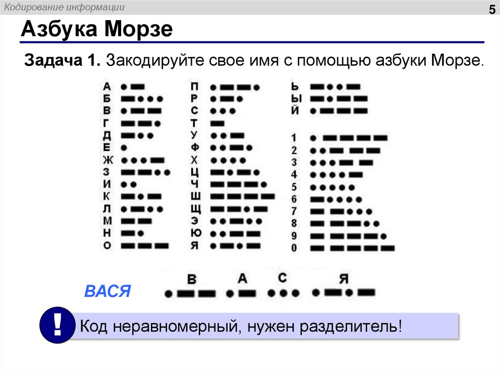 Задача 1. Закодируйте свое имя с помощью азбуки Морзе.
