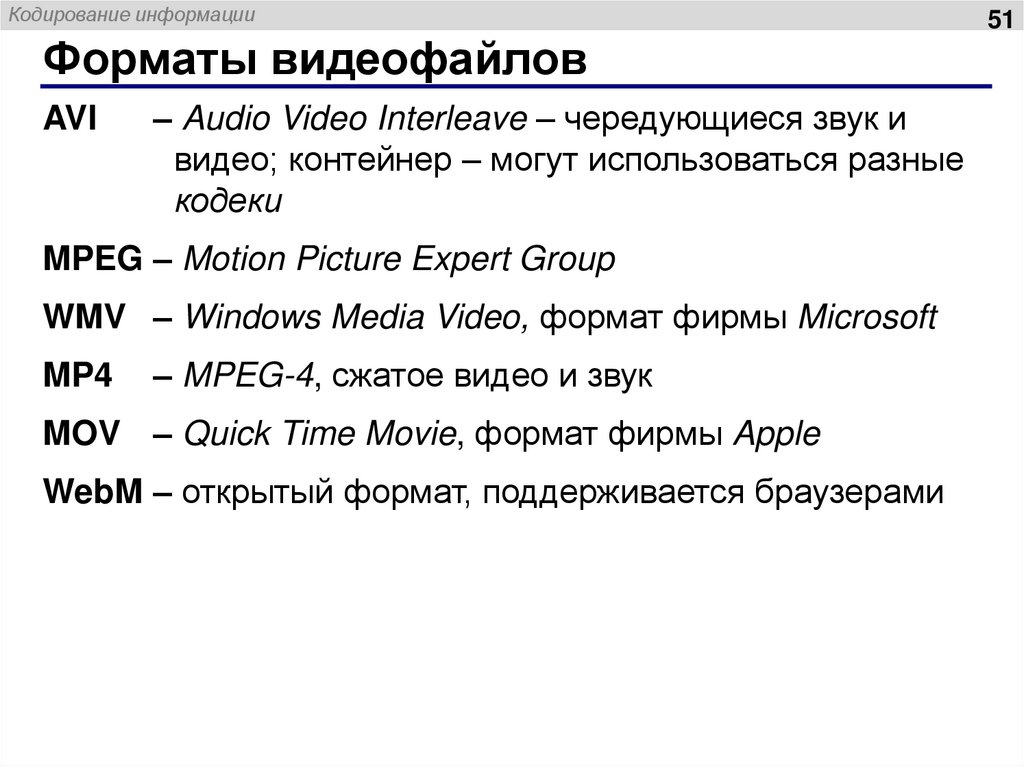 • DivX, Xvid, H.264, WMV, Ogg Theora…