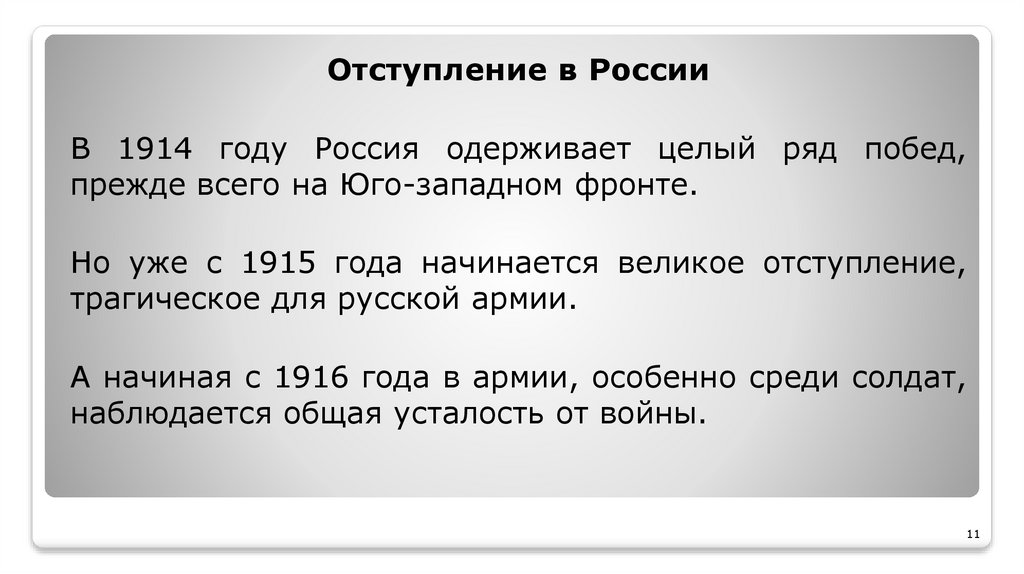 Отступление в РоссииВ 1914 году Россия одерживает целый ряд побед,