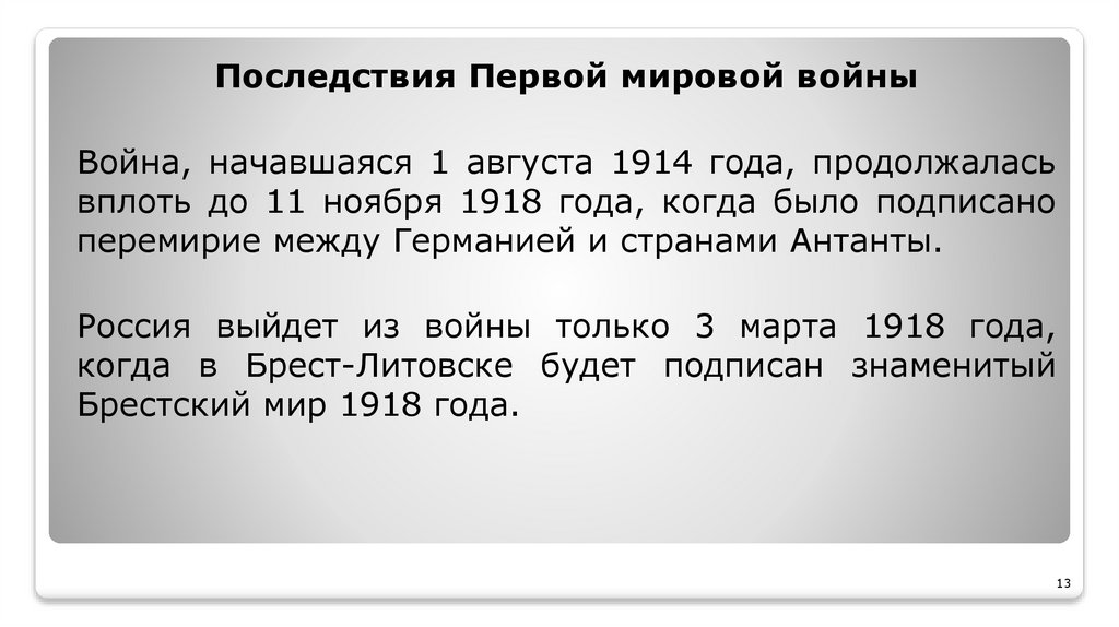 Последствия Первой мировой войныВойна, начавшаяся 1 августа 1914 года, продолжалась