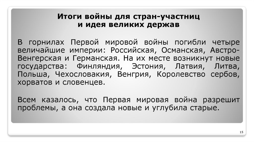 величайшие империи: Российская, Османская, АвстроВенгерская и Германская. На их месте возникнут новые