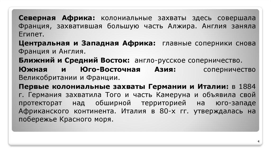 Северная Африка: колониальные захваты здесь совершалаФранция, захватившая большую часть Алжира. Англия заняла