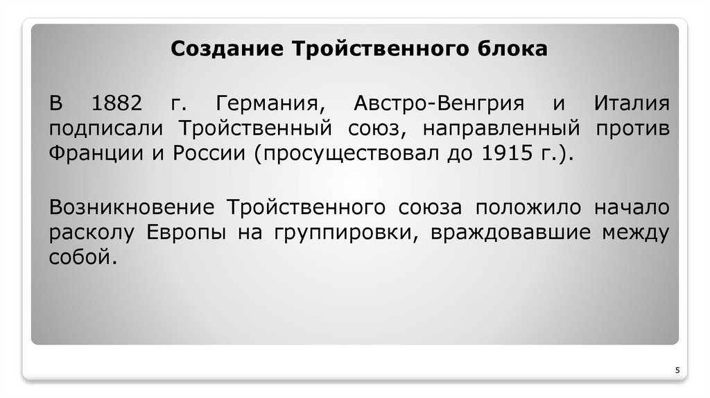 Создание Тройственного блокаВ 1882 г. Германия, Австро-Венгрия и Италия